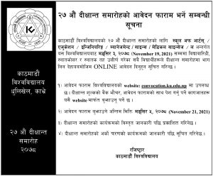 काठमाडौ, कात्तिक २३ काठमाडौ बिश्वबिद्यालयले आफ्नो सत्ताईसौ दिक्षान्त समारोह गर्ने भएको छ । बिश्वबिधालय बाट स्कुल अफ आर्ट्स, एजुकेशन इन्जिनियरिङ/म्यानेजमेन्ट