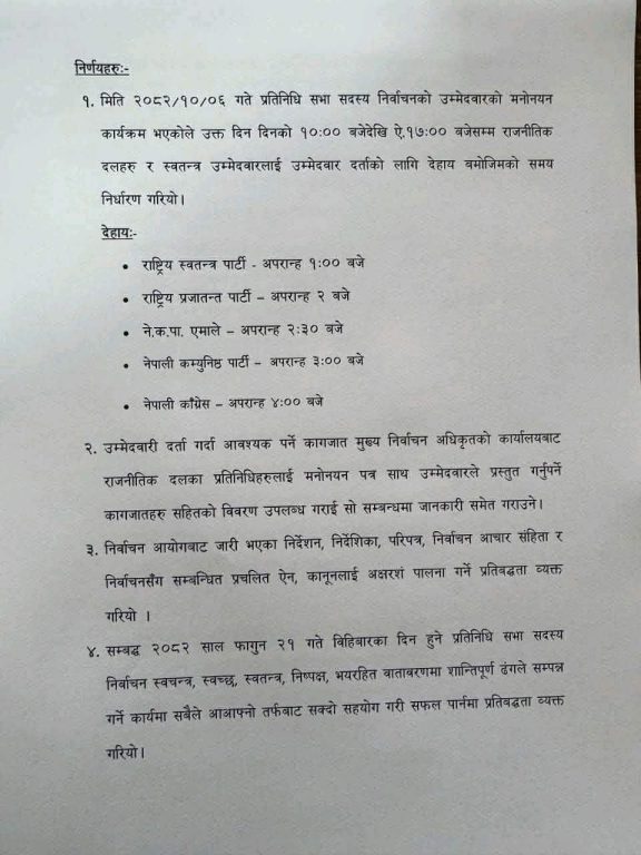 जिल्लामा दलका उमेदवार मनोनयनका लागि जिल्ला निर्वाचन कार्यालयले माघ ६ गते बिहान १० बजे देखि बेलुकी ५ बजे सम्मको समय तालिका समेत सार्वजनिक गरेको छ।
